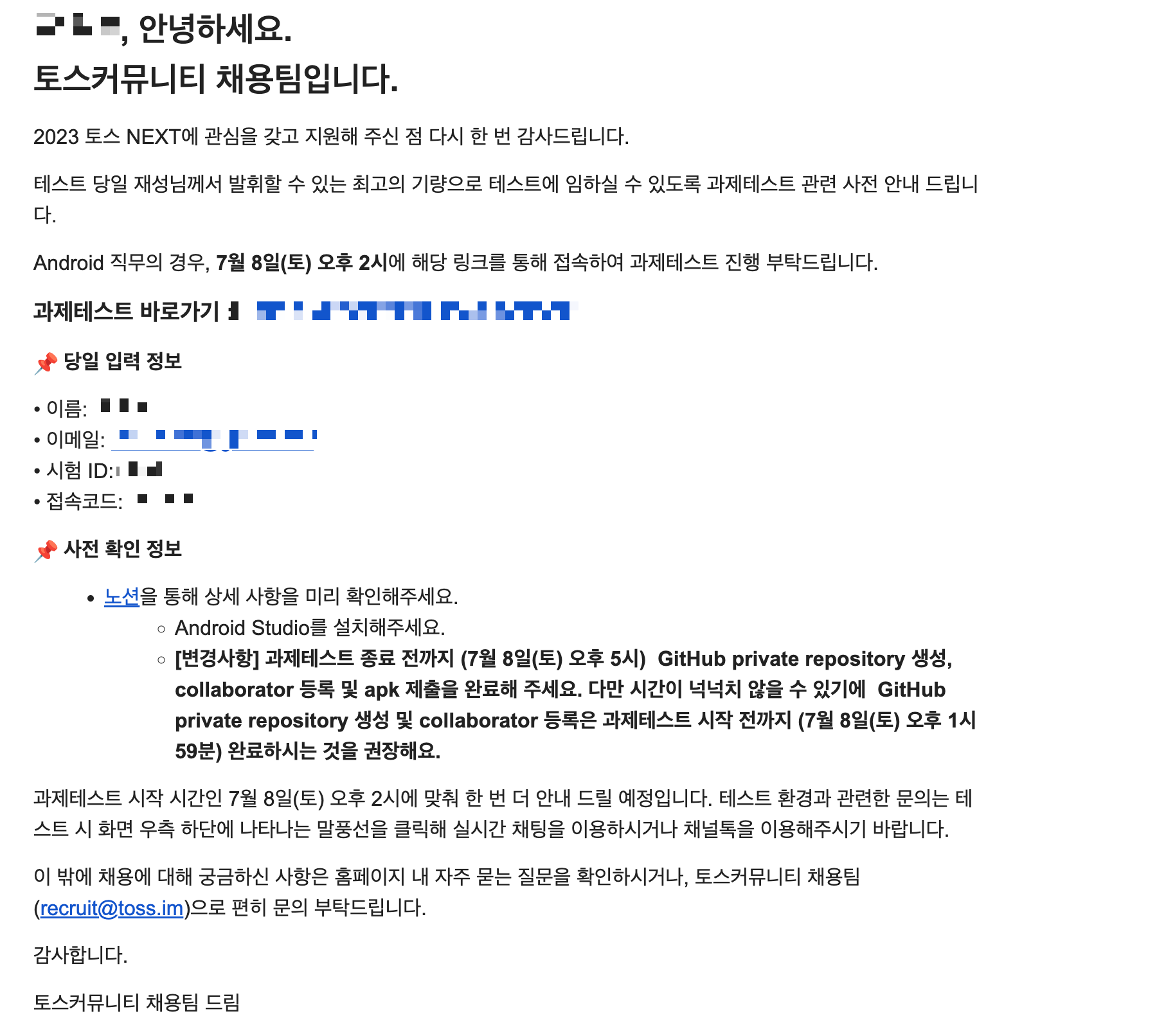 참가신청을 하게되는 경우 별도 메일과 테스트 진행 방식에 대한 설명과 노션 링크를 받을 수 있다. 기존 코딩테스트 방식에서 과제 테스트 방식으로 처음 변경된 거 같다.(Android 직무 한정)