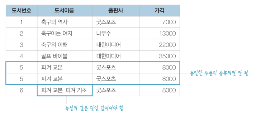 - 중복이 필요한 경우 투플을 하나 더 만들어 속성의 값이 단일 값이 되도록 나누어야 한다.