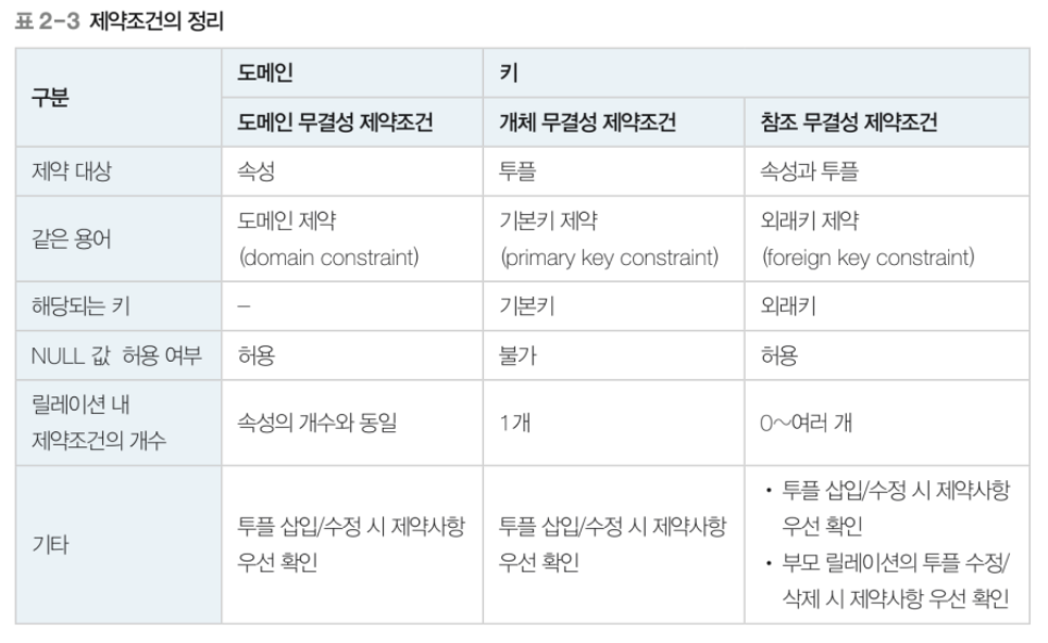 데이터를 저장하는데 있어서 데이터베이스는 일관성을 유지하고 중복을 제거하는 등 데이터의 신뢰도를 유지해야 한다. 따라서 데이터의 삽입, 삭제, 수정 시 여러 가지 제약조건이 따른다.