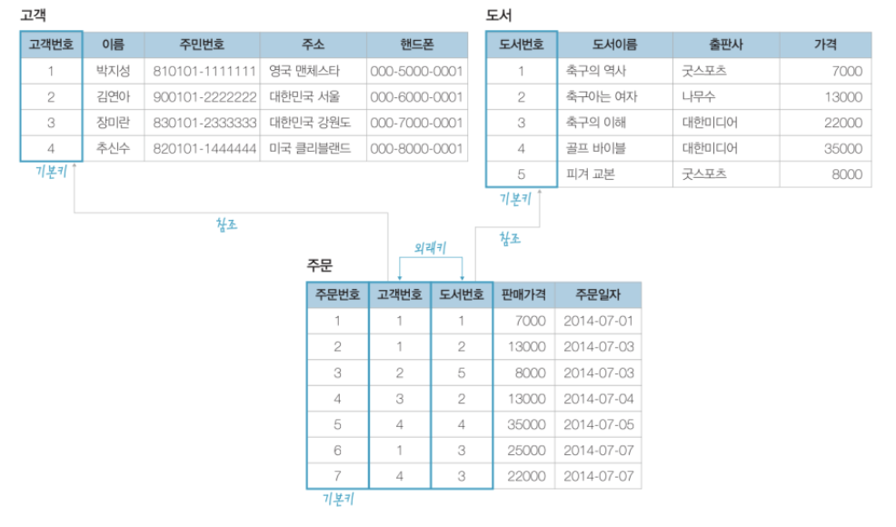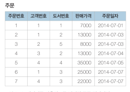 주문 릴레이션의 기본키인 주민번호는 고객이 도서를 주문하면 생성된다. 이때 해당되는 고객번호와 도서번호도 주문 릴레이션에 저장된다. 주문 릴레이션에서 주문번호를 알면 어떤 고객이 어떤 도서를 구입했는지 알 수 있다.