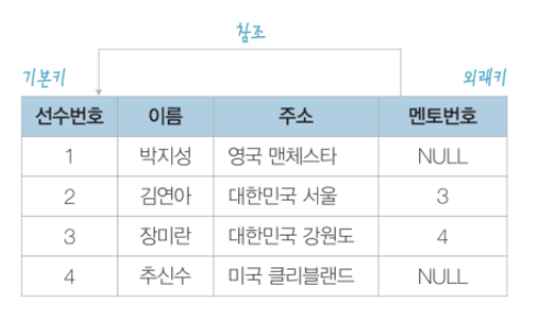 - 자기 자신의 기본키를 참조하는 외래키도 가능하다.