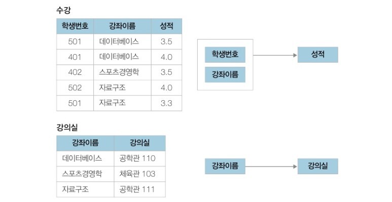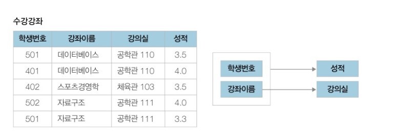 학생수강성적 테이블이다. 각 속성 사이에는 의존성이 존재하는데 예를 들어 강좌이름이 데이터베이스인 경우 강의실은 공학관 110호 한 곳뿐이다. 반면 학생이름이 박지성인 경우 강좌이름은 데이터베이스도 있고 자료구조도 있다. 강의실은 강좌이름만 알면 바로 알 수 있지만 강좌이름은 학생이름만으로 바로 알 수 없다.