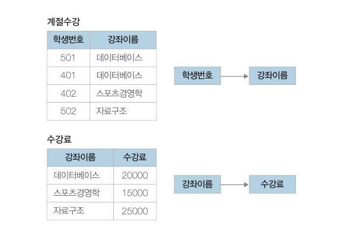 계절학기 릴레이션이다. 해당 릴레이션에서는 학성번호, 강좌이름, 수강료를 저장하는데 계절학기 특성상 학생은 하나의 강의만 신청할 수 있다고 가정해 보자.