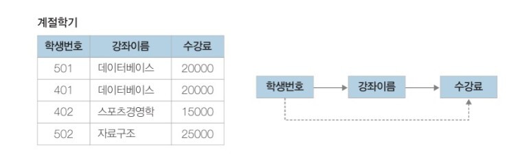 이상현상의 원인은 계절학기 릴레이션의 함수 종속성 다이어그램을 보면 알 수 있다. 계절학기 릴레이션의 기본키는 학생번호이고, 기본키가 아닌 속성은 강좌이름, 수강료이다. 강좌이름, 수강료는 모두 기본키에 함수적으로 종속되어 있다. 여기서 문제는 수강료는 강좌이름에 한 번 더 종속되어 있다는 것이 문제이다.