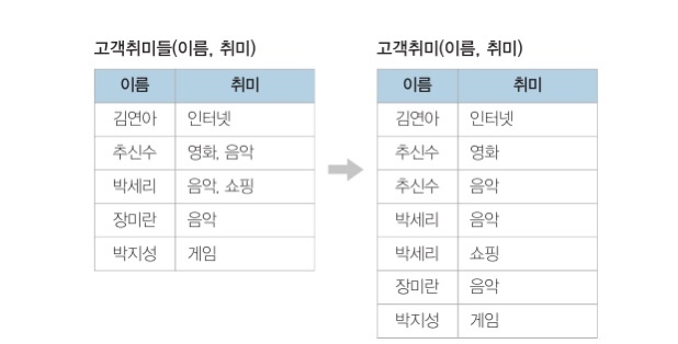 고객취미들 릴레이션을 고객취미 릴레이션으로 바꾸어 저장하면 제 1 정규형에 부합하게 된다.
