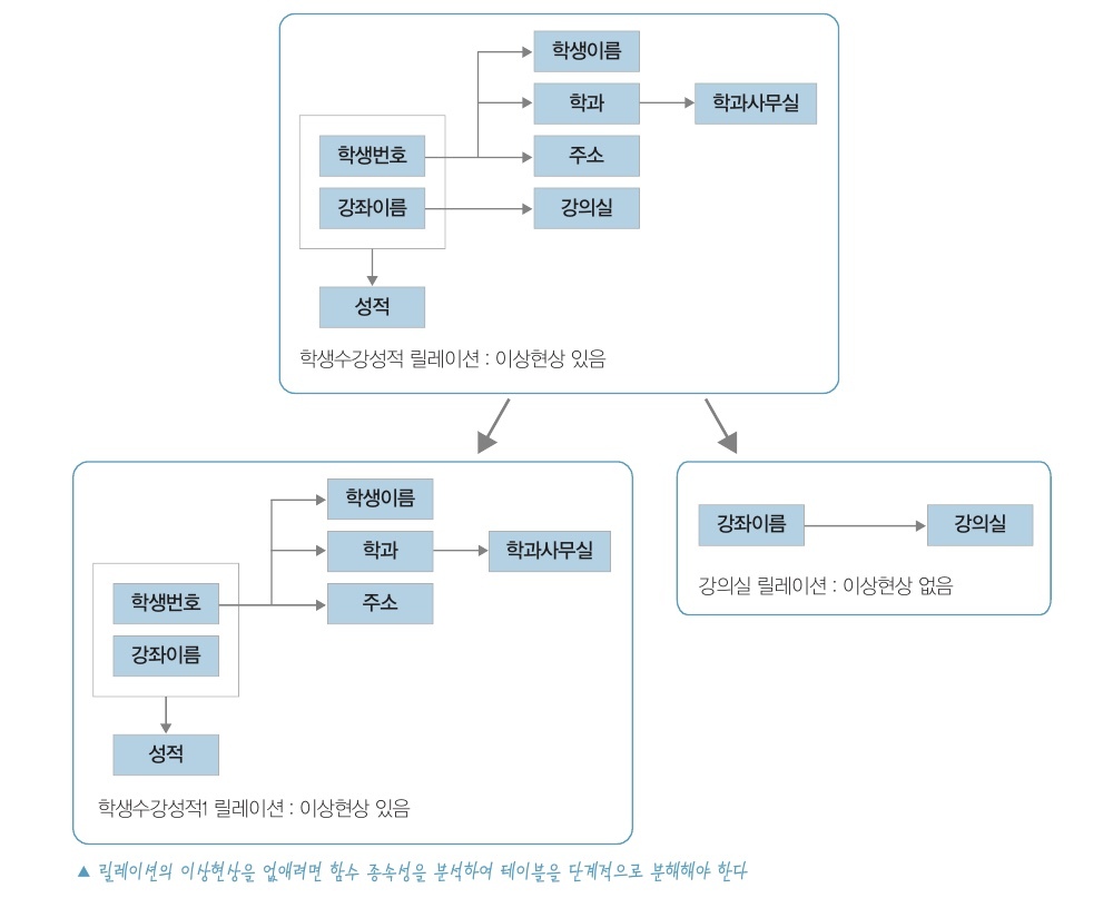 - 수정이상 : 데이터베이스 강의실을 공학관 113호로 변경할 경우 데이터 불일치가 발생할 가능성이 있다.