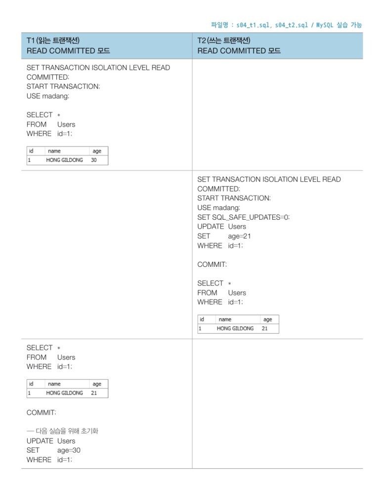 트랜잭션은 1은 읽기만 하기 때문에 갱신손실 같은 심각한 문제가 발생하지 않는다. 그러나 트랜잭션 1에서 오손 읽기(dirty read) 문제, 반복불가능 읽기 문제, 유령 데이터 읽기 문제 등이 발생할 수 있다. 읽기만 하는 트랜잭션이 쓰기 트랜잭션에서 작업한 중간 데이터를 읽기 때문에 발생하는 문제들이다.
