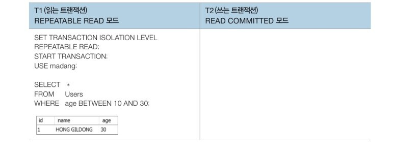 트랜잭션 T1은 읽기만 하고 T2는 쓰기(삽입, INSERT)를 한다. T1은 데이터를 읽고 작업을 한 후, 그 사이에 T2가 변경한 데이터를 다시 한 번 읽어와 작업을 한다.